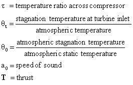 Now we have two steps left. First we write tc in terms of tt, by noting that they are related by the condition that the power used by the compressor is equal to the power extracted by the turbine. Second, we put the burner temperature ratio in terms of the exit temperature of the burner, (TT4 or more specifically qt=TT4/To) since this is the hottest point in the engine and is a frequent benchmark used for judging various designs.
