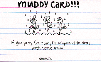 People seemed a little tired today and there were many late arrivals. Based on the muddy cards, it also seems that some people may not be doing the reading before class. Previously it had seemed that most of the people were doing the reading so I haven't set any for-credit reading assignments or quizzes. I will probably set a short for-credit reading assignment for Monday's lecture.