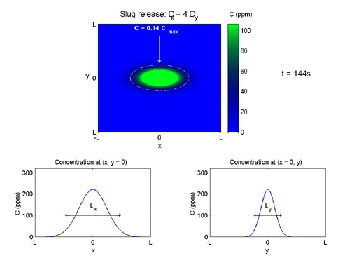 This animation depicts the diffusion of a discrete mass released at (x = 0, y = 0, t = 0). The diffusion is anisotropic, Dx = 4 Dy. The length scales grow in proportion to the square root of the diffusion, such that the dimensions of the cloud are anisotropic, with Lx = 2 Ly. Note that the profiles of concentration along the x- and y-axes are Gaussian in shape. For some background and thought problems pertaining to this animation, review the theory (page 6) behind the diffusion of instantaneous, point releases.