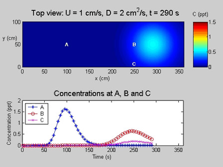 The following animation displays temporal records of concentration at three points after a mass is instantaneously released into a uniform flow. The concentration is Gaussian about the center of mass, which travels at a velocity U. The Peclet number of all measurement locations is high, so the maximum concentration is observed at roughly the advection time-scale.