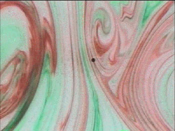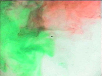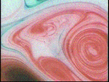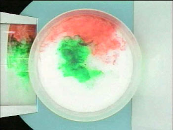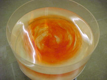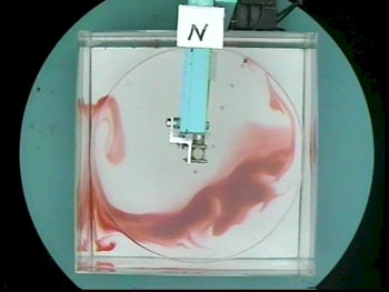 Here’s a shot of the rotating tank some minutes after the coloring has been introduced. It’s also fun to use two different colors and watch the interleaving of fluid.