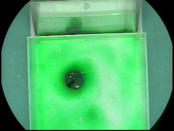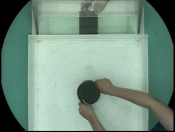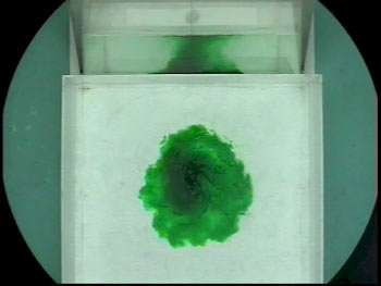 The table is set into rapid rotation at a speed of about 14 rpm (f = 3) and allowed to settle down for 20 minutes or so. Whilst the table is rotating we carefully and slowly remove the water within the cylinder and replace it with dyed, saturated salty (and hence dense) water delivered from a small beaker. When the hollow cylinder is full of colored saline water, it is rapidly removed in a manner which causes the least disturbance possible. Practice may be necessary.