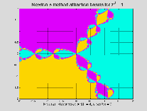 Figure 1 illustrates the complicated patterns of convergence that Newton’s method for finding roots can have. Here we have plotted the basins of attraction for the three cubic roots of unity under iterations using Newton’s method. Each color corresponds to a root. Notice how complicated the boundary between the regions is!