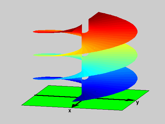 Riemann Surface for f(z)=log(z2-1). The picture shows only three levels of the surface, which extends up and down with infinitely many similar levels (again, notice the similarity with a parking building). This is an example with three branch points, which are at: z=1, z=-1 and infinity (in all the prior examples there were only two branch points). Geometrically, using the analogy with a parking building, we note that here the connecting ramps are actually two, one going from infinity to z=-1 and the other from z=1 to infinity.