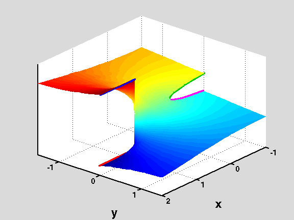 Then we join them along the corresponding lips of the branch cuts on x > 1 (marked with thick red and blues lines on the figure) matching colors (red to blue on the next surface). This process leaves a gap at each level (due to the cut on x < 0, whose edges are marked by the magenta and green lines on the picture). These gaps are filled using the surfaces generated by the branches of f=f(z) that do not have z=1 as a branch point.
