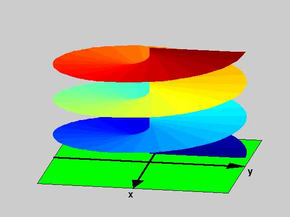 Infinite spiral staircase-like Riemann Surface for the logarithm. The picture shows only three levels of the surface, which extends up and down with infinitely many similar levels (all joined at the branch point at the origin).