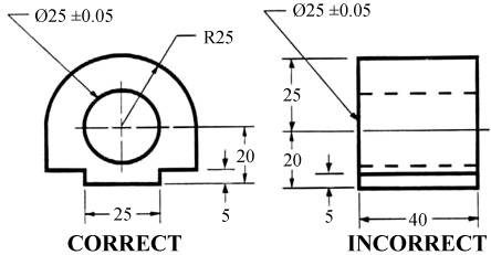 The dimensions should be placed on the face that describes the feature most clearly. Examples of appropriate and inappropriate placing of dimensions are shown in figure 25.