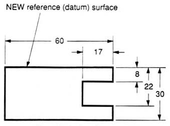 We have to make some choices when we dimension a block with a notch or cutout (figure 27). It is usually best to dimension from a common line or surface. This can be called the datum line of surface. This eliminates the addition of measurement or machining inaccuracies that would come from “chain” or “series” dimensioning. Notice how the dimensions originate on the datum surfaces. We chose one datum surface in figure 27, and another in figure 28. As long as we are consistent, it makes no difference. (We are just showing the top view).