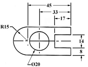 This drawing is symmetric about the horizontal centerline. Centerlines (chain-dotted) are used for symmetric objects, and also for the center of circles and holes. We can dimension directly to the centerline, as in figure 31. In some cases this method can be clearer than just dimensioning between surfaces.