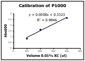 In this assay you will calibrate your pipets by measuring the absorbance of the XC dilutions you made. Beer’s Law, which relates absorbance to concentration, will be derived as part of experimental module 2. Here, you’ll see that the graph of absorbance versus volume of 0.01% XC is a straight line… or at least it should be!