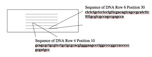 Today you will use one tool, a DNA microarray, to simultaneously examine the expression of many genes. DNA microarrays are slides with DNA sequences spotted in a known order on the surface. The spots of DNA, each one smaller than the period at the end of this sentence, are placed on the slide surface with robotic arms or built one base at a time with photolithography. Each spot of DNA gets a unique address on the slide surface, and the identity and location of each spot get stored in the computerized “design file” for the array. The slide shown below is the same size as the one you’ll use (1 x 3 inches) but yours will have 4 arrays each with 44,000 spots of DNA instead of the 250 dots shown!
