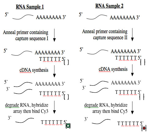 Creating cDNA from RNA is done using an enzyme called reverse transcriptase. Like all DNA polymerases, this enzyme can only add sequence to an existing chain and so needs a short “primer” to begin synthesis. To perform the cDNA synthesis, you will use a kit from a company named Genisphere. The primers in this kit have a special “capture sequence” at their 5’ end. The capture sequences allow the cDNA to be reacted with Cy3 or Cy5 later.