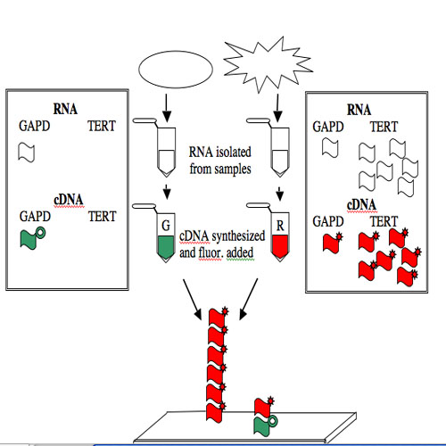 For this example, the normal cells get green and the cancerous cells get red. The two colored samples are mixed and then simultaneously hybridized to a DNA microarray. The DNA spotted on the surface of the slide is in vast excess to either colored cDNA sample and so the intensity of each color will vary with the amount of RNA originally present in each sample. A gene expressed similarly in normal and cancerous cells, like the housekeeping GAPD gene, will give rise to a yellow spot in Row 6 Position 30 since equal amounts of green and red cDNA will be bound there and the merged color will appear yellow. By contrast, only red cDNA will bind at Row 4 Position 10 since cancerous cells express telomerase and normal cells do not.
