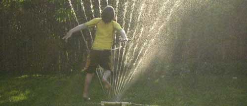 Child jumping through sprinkler, with sunlight. Photo by Natalie Kuldell.