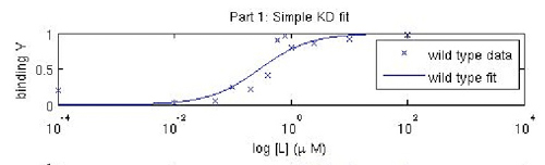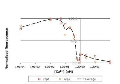 Raw titration curve for IPC. Shown here is sample data from the teaching lab: normalized fluorescence for wild-type inverse pericam as a function of calcium concentration. As you will later learn, an apparent KD can be estimated from such a plot: it is the point on the x-axis where the curve crosses y = 50%, or ~0.5 μM here