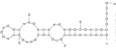 Public domain image. (Prepared using RNA Folding (mfold) at the mFold Web Server). Reference: Zuker, M. “Mfold Web Server for Nucleic Acid Folding and Hybridization Prediction.” Nucleic Acids Res. 31, no. 13 (2003): 3406-3415.