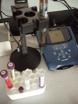 - Manipulate the mechanical arm that holds the electrode to place the electrode 1/2 way into the 15 ml conical tube with calibration buffer pH 7.0. The green measurement tip should be submerged. Press the “measure” button in the upper right corner of the pH meter’s control panel. Wait for the reading to stabilize, for the “AR” light to stop flashing and note how close the reading is to pH 7.