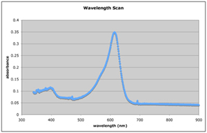- Scan one of your XC samples. Does the output resemble the sample shown here? How does it differ (if at all)? Do you know why? Do you know why there is a peak at ~600 nm?