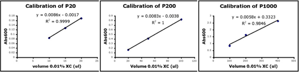 Calibration curves for P20, P200, and P1000.
