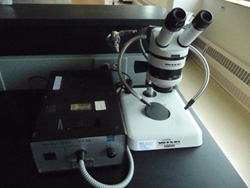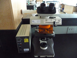 Much of biology examines natural components that are too small to see. Imaging technology took a gigantic step forward in the 1680s when Anton van Leeuwenhoek ground a microscope lens sufficiently fine to see a living cell (a bacteria he had scraped from his teeth!). His microscope had one lens and the image he saw was approximately 250 times its natural size (250X magnification). Compound microscopes, like the ones we have in lab, use a second lens to magnify the image from the first and can increase the total magnification up to 1000X. One of our microscopes is also attached to a beam splitter that allows excitation light to be separated from emitted light. This allows us to perform fluorescence microscopy.