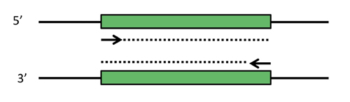 PCR schematic. Depicted are two complementary strands of DNA, with a desired target fragment shown in green. Primers that can select the target sequence are shown as short arrows, with the dotted lines indicating the extension step of PCR. Note that in the first couple rounds of PCR, products longer than the desired target will be made (dotted lines keep extending). However, these early products themselves become templates that produce the correct product in abundance.
