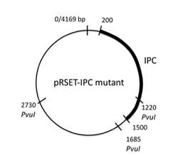 A silent mutation can be introduced that results in a new PvuI site at the 341st-342nd residues of inverse pericam (ATT → ATC and TAC → GAC) , or approximately the 1020th basepair of IPC. When IPC is inserted into pRSET, its starting point is ~200bp into the pRSET plasmid. Thus, if the mutated pRSET-IPC plasmid is digested with PvuI, three linear fragments of DNA are the result: 470, 1050, and 2660 bp. To understand these calculations, see also the plasmid maps below. Make sure you can reproduce the numbers above before proceeding with your own samples.