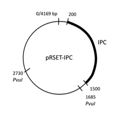 The pRSET plasmid with inverse pericam insert, or pRSET-IPC, is 4169 basepairs long. According to the cutters list (PDF) that you used on Day 1, restriction site PvuI occurs at ~1685 bp, and again at ~2730 bp into pRSET-IPC. Thus, digesting this parental plasmid with the PvuI enzyme should result in two linear fragments of DNA, with about 1050 and 3120 bp sizes.