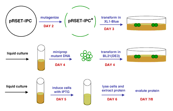 Once you have the plasmid DNA isolated, you can prepare it for sequencing and gel analysis, as well as use it immediately for transformation. In order to transform BL21(DE3) cells with your mutant IPC plasmids, you will first have to make the cells competent, i.e., able to efficiently take up foreign DNA. With the XL1-Blue strain, we used commercially available competent cells that did not need further treatment prior to DNA addition. Today, you will make chemically competent cells yourself using calcium chloride, then incubate them with plasmid DNA and heat shock them as before prior to plating. Tomorrow, the teaching staff will pick colonies and set up liquid overnight cultures from your transformed cells. Next time, you will add IPTG to these liquid cultures to induce expression of your mutant proteins, which you will then isolate and characterize. Much of this process is summarized in the figure above.
