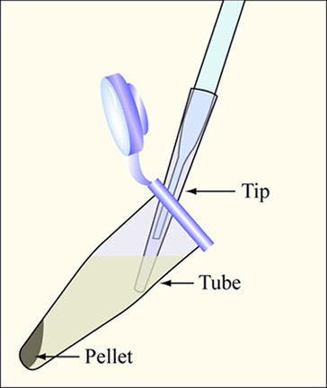 - Immediately remove the supernatant with your P1000, making sure to keep the tip on the side of the tube that doesn’t have your pellet. Remove as much liquid as possible, using your P200 set to 100 μL, to remove the last few droplets and/or to streak them up the side of the tube to promote evaporation.