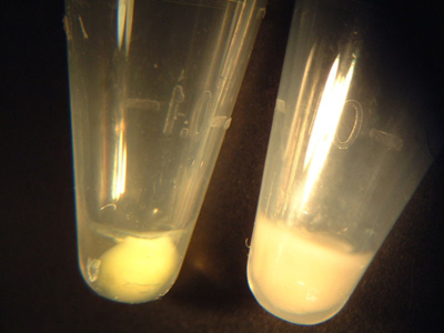 Examples of IPTG-induced (left) and control (right) cell pellets. The induced pellet has a yellow-green tint, in contrast to the plain white control pellet.