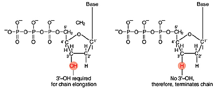 Left: Normal bases versus chain-terminating bases. Center: Sequencing gel example. Right: Sequence trace data example.