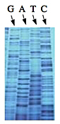 The invention of automated sequencing machines has made sequence determination a relatively fast and inexpensive endeavor. The method for sequencing DNA is not new but automation of the process is recent, developed in conjunction with the massive genome sequencing efforts of the 1990s. At the heart of sequencing reactions is chemistry worked out by Fred Sanger in the 1970s which uses dideoxynucleotides (see schematic above left). These chain-terminating bases can be added to a growing chain of DNA but cannot be further extended. Performing four reactions, each with a different chain-terminating base, generates fragments of different lengths ending at G, A, T, or C. The fragments, once separated by size, reflect the DNA’s sequence. In the “old days” (all of 10 years ago!) radioactive material was incorporated into the elongating DNA fragments so they could be visualized on X-ray film (image above center). More recently fluorescent dyes, one color linked to each dideoxy-base, have been used instead. The four colored fragments can be passed through capillaries to a computer that can read the output and trace the color intensities detected (image above right). Your sample was sequenced in this way on an ABI 3730 DNA Analyzer.