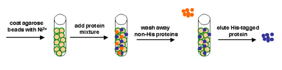Affinity separation process. Green represents Nickel, blue the (His-tagged) protein of interest, and orange the other proteins in the cell extract.