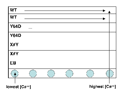 Today you will obtain titration curves against calcium for your wild-type and mutant proteins using an automated fluorescence plate reader. This machine reads multiple samples in a standard format – in our case, a 96-well microtiter plate. The output is a grid of up to 96 fluorescence values, for rows A-G and columns 1-12, which is amenable to analysis with a program like Excel.