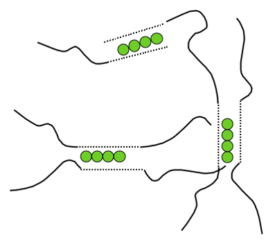 Schematic of cross-linked alginate. G-blocks are represented by dotted lines, M-blocks by curved solid lines, and calcium ions by green circles.
