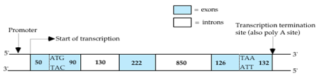 Shown below is the genomic structure of the human β-globin gene. The numbers within the boxes indicate the length (in nucleotides) of each region. The DNA sequences corresponding to the start codon and the stop codon are indicated.