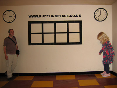 This scene was designed to trick your eyes into seeing the adult (who is in the distance) as smaller than the kid. Our brain knows certain things about the world: That squares are square, and that floors and ceilings are parallel. These are facts about the world that allow us to interpret what we see. However, everything in this room is slanted. This illusion is interesting because the size information given by the depth cues (texture and perspective) contradict what we know about the actual size of people.