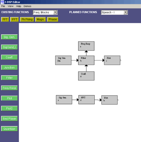 For a quick example we can design an FIR or IIR filter. The figure below is the main screen of the J-DSP editor, refer to it while reading the example below.
