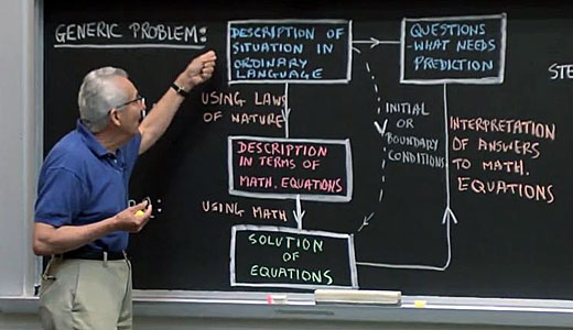 The mathematical description of the problem marks the end of the first stage. Next, we do something miraculous: We forget that the mathematical equations and boundary conditions have anything to do with physics. We put these equations into a computer, or we ask our friendly mathematics professor to solve the equations. We don’t have to tell the computer this has anything to do with a physical problem. To the professor, we only need to say, “Look, I have these equations with these boundary conditions. What will happen to the value with time of this quantity as a function of that quantity?” Stage two has nothing to do with physics! We’ve entered the world of mathematics. Only after you have solved the equations—and, of course, you must do that correctly—can you return to physics. This involves knowing the rules for identifying what actually happens from the solution to your equations.